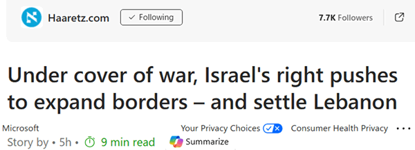A map published by the Uri Tsafon movement proposing Hebrew names for new settlements in southern Lebanon. Credit: Uri Tsafon ............. แผนที่อ้างอิงบริเวณอิสราเอลต้องการขยายเมือง เช่นเดียวกันกัขบริเวณที่ดินของชาวปาเลสไตน์ ที่ West Bank อิสราเอลปล่อยให้พวก Settlers บุกทำร้ายชาวปาเลสไตน์ ที่ทำไร่มะกอก เผาบัาน เผาต้นมะกอก ชาวปาเลสไตน์ ทนอยู่ไม่ได้ก็ต้องย้ายออก แล้วพวก Settlers ก็เข้าครอบครอง ทั้งนี้ด้วยการสนันสนุนของ นักการเมืองกลุ่มขวาจัดของอิสราเอล